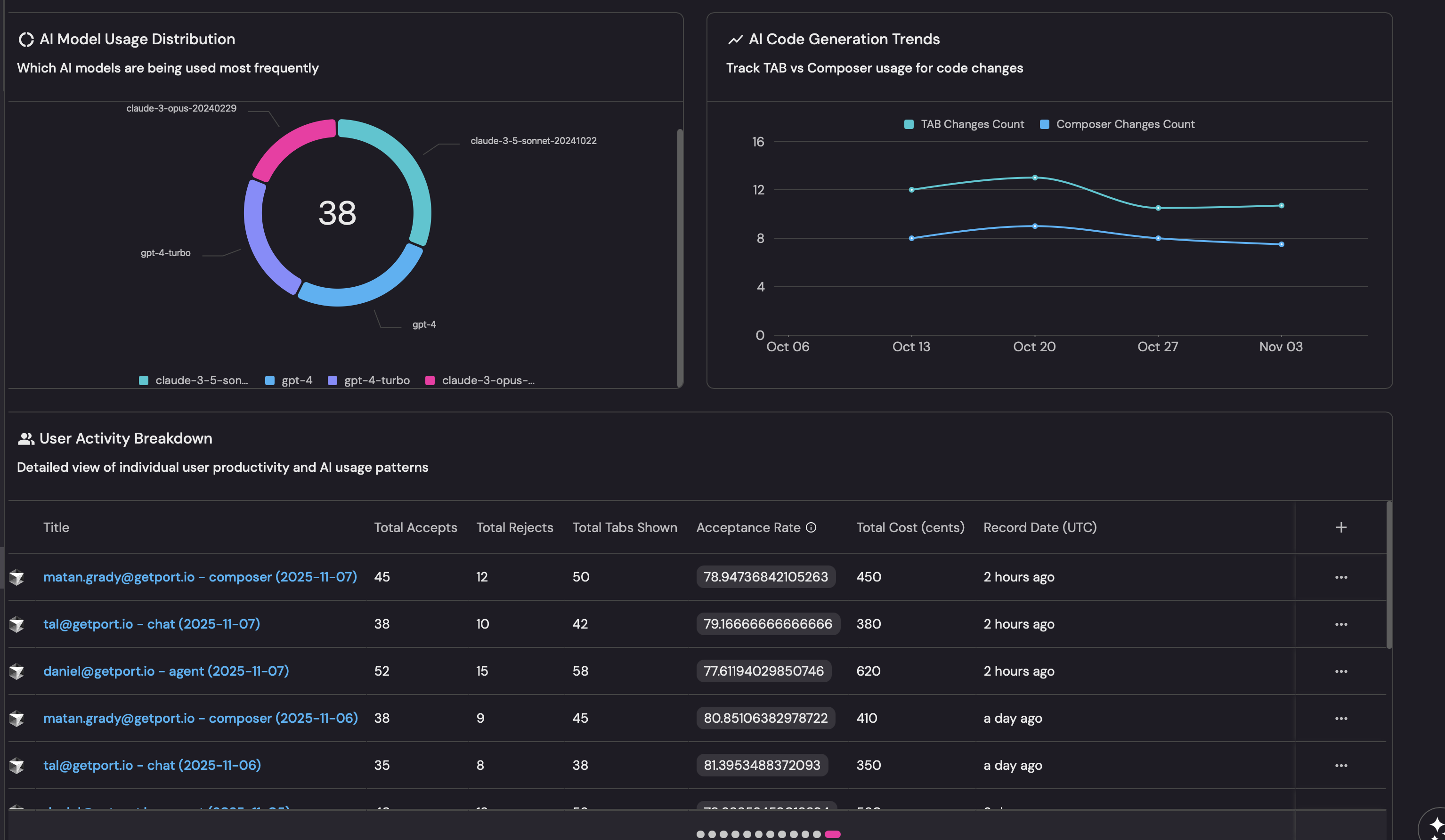 Detailed view of individual user productivity and AI usage patterns. -