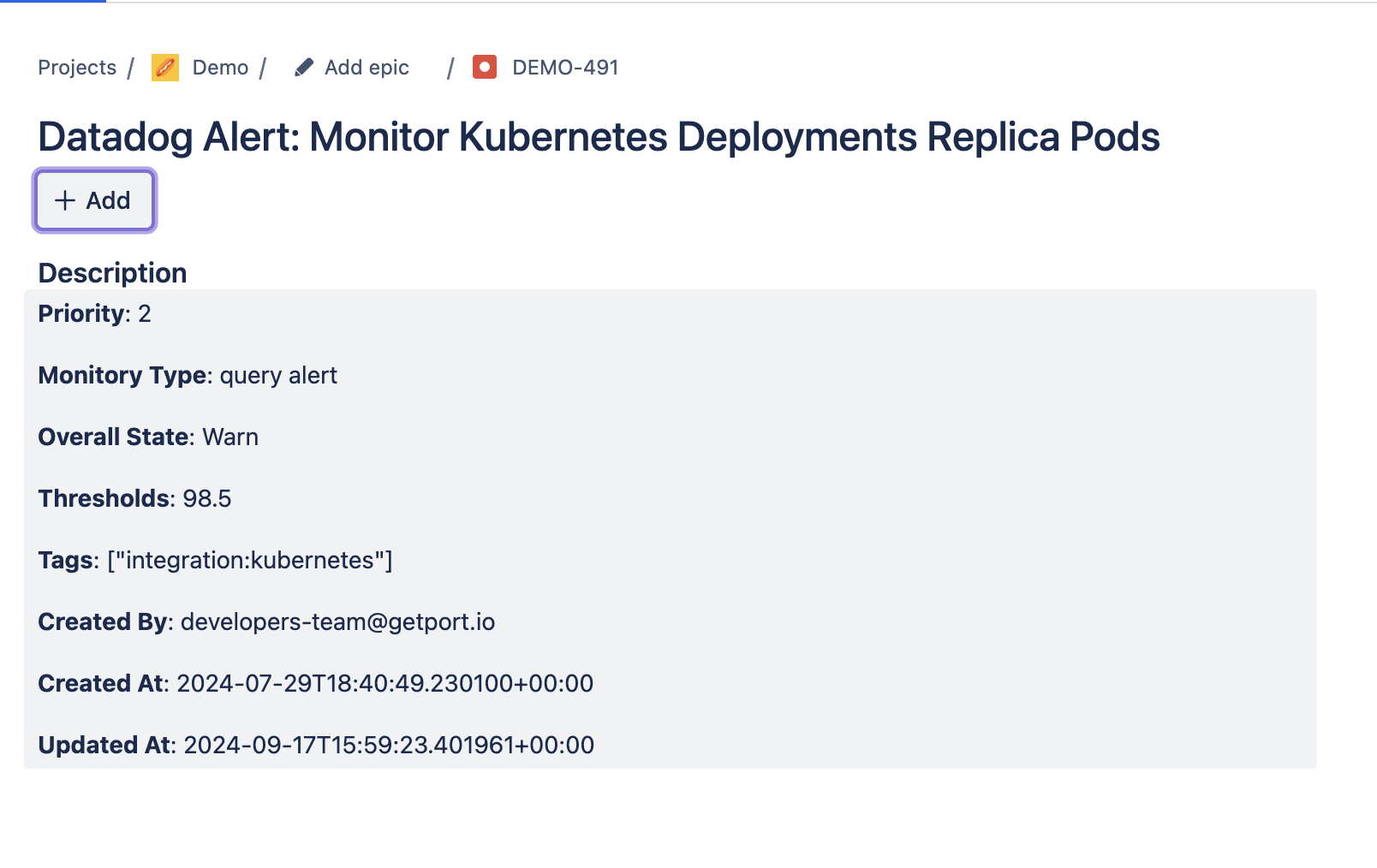 Now, every time a Datadog Alert priority is raised to high or critical (i.e., moves from 3, 4, or 5 to 1 or 2), a Jira issue like the one below will be created: