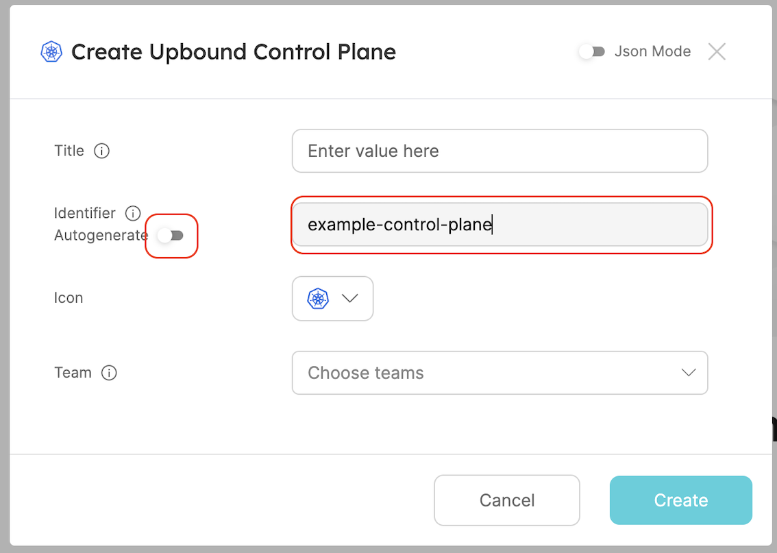 1. In the identifier field, insert the Upbound control plane identifier which we saved earlier and click create (do this step multiple times if there are more than 1 control plane).