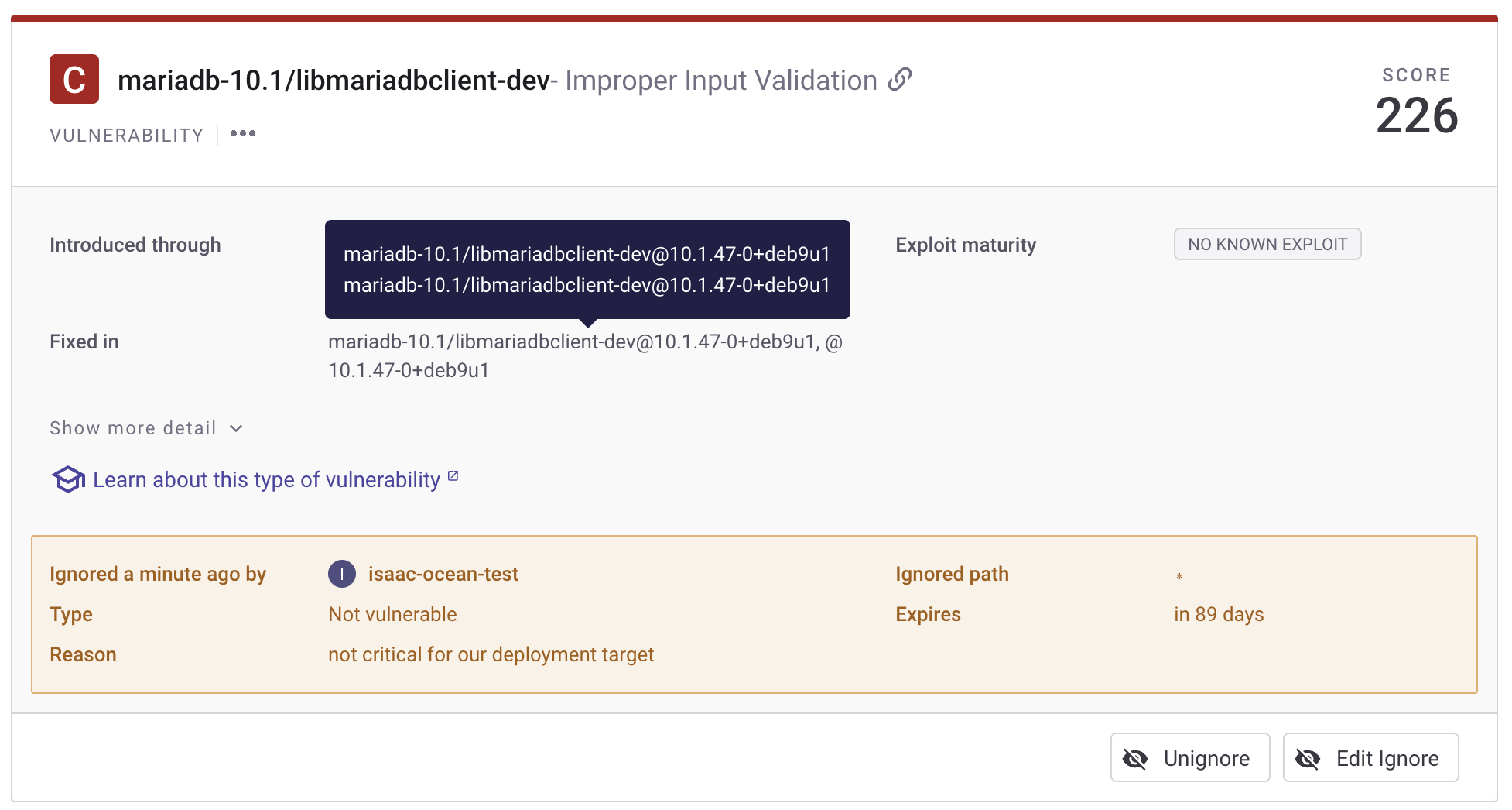"description": "Ignore a Snyk vulnerability with reason and expiration date.",