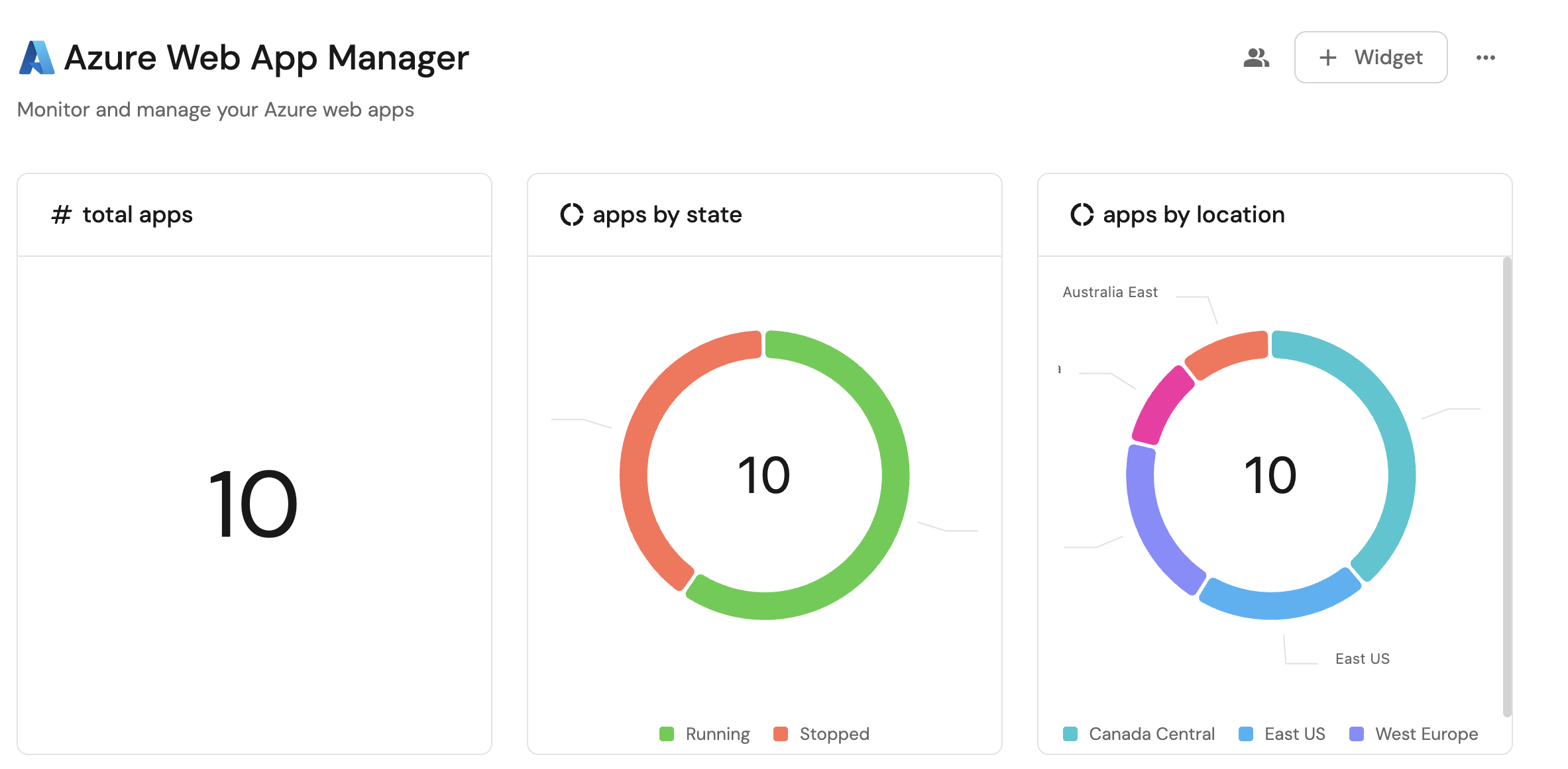 + Widgetand select Action card. - Choose the Start Azure Web App, Stop Azure Web App and Restart Azure Web App actions we created in this guide.