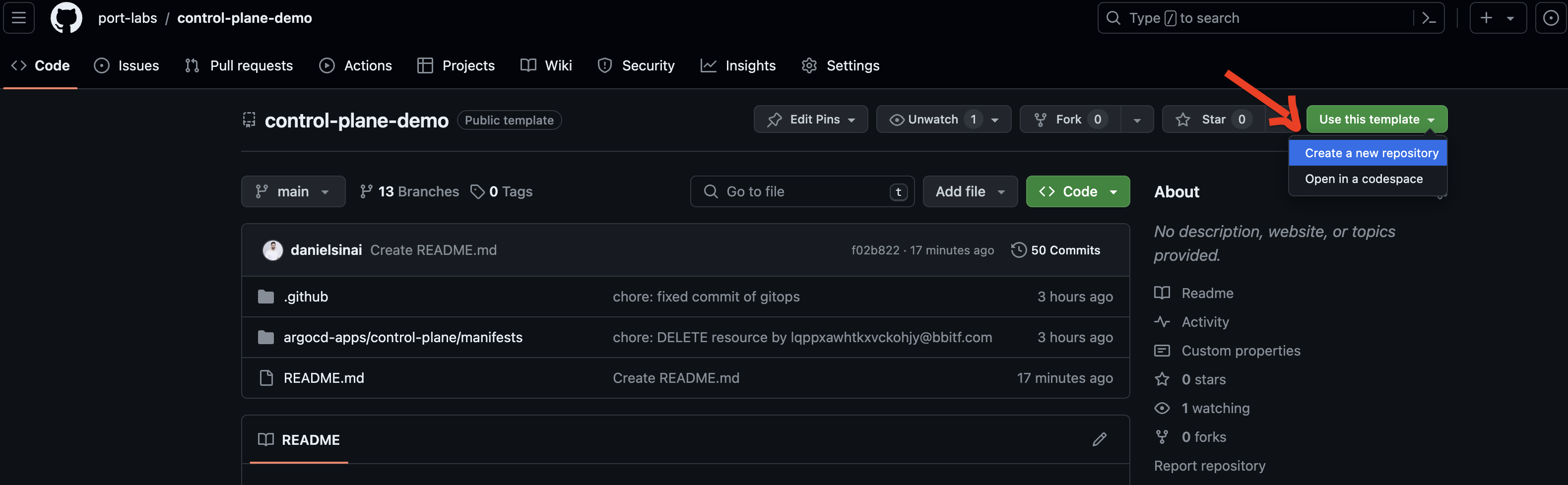 - Go to the GitHub control plane example repo and use it as a template to create your own repo by clicking on the