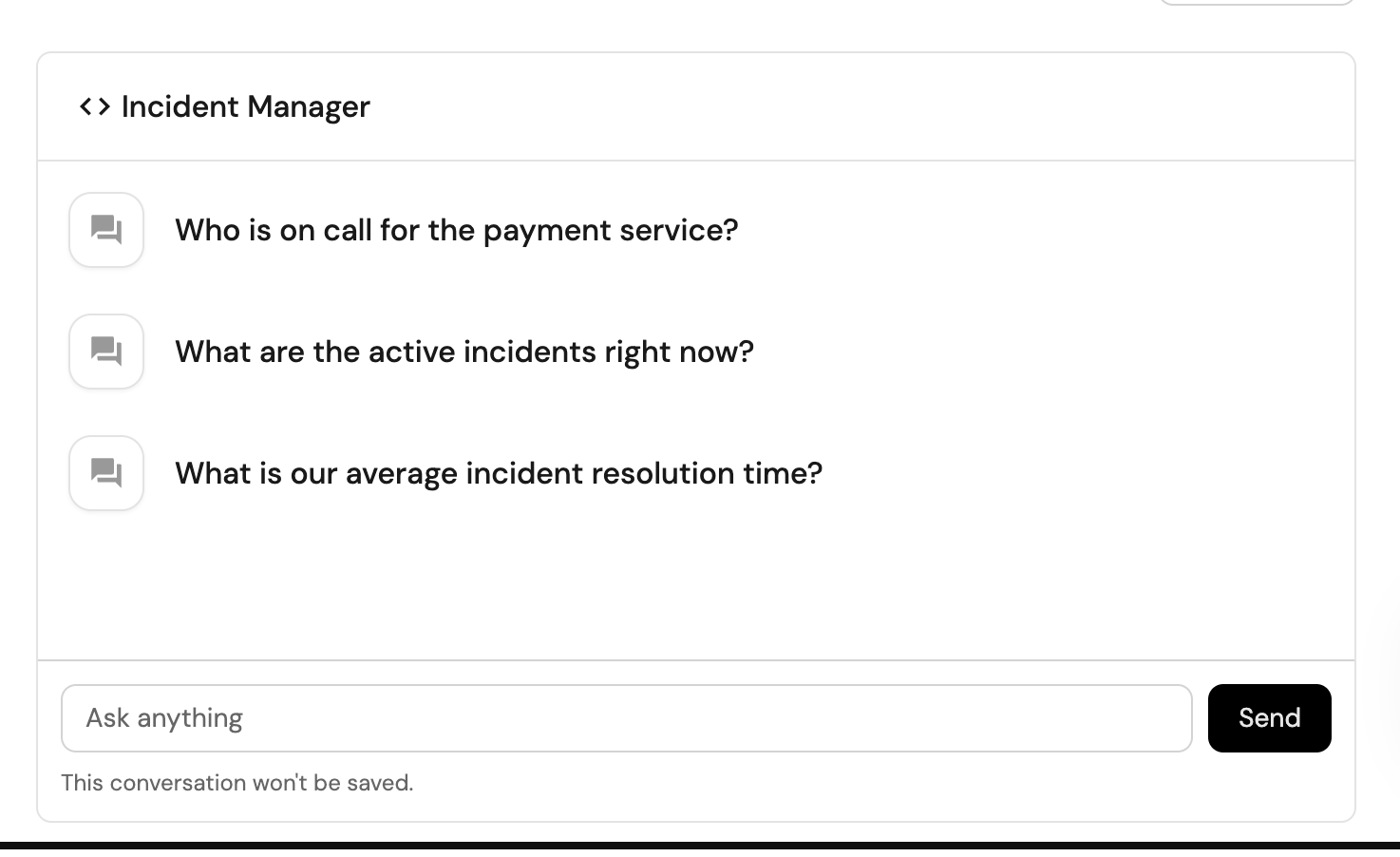 • The data sources it will use to answer questions about incidents and on-call rotations.