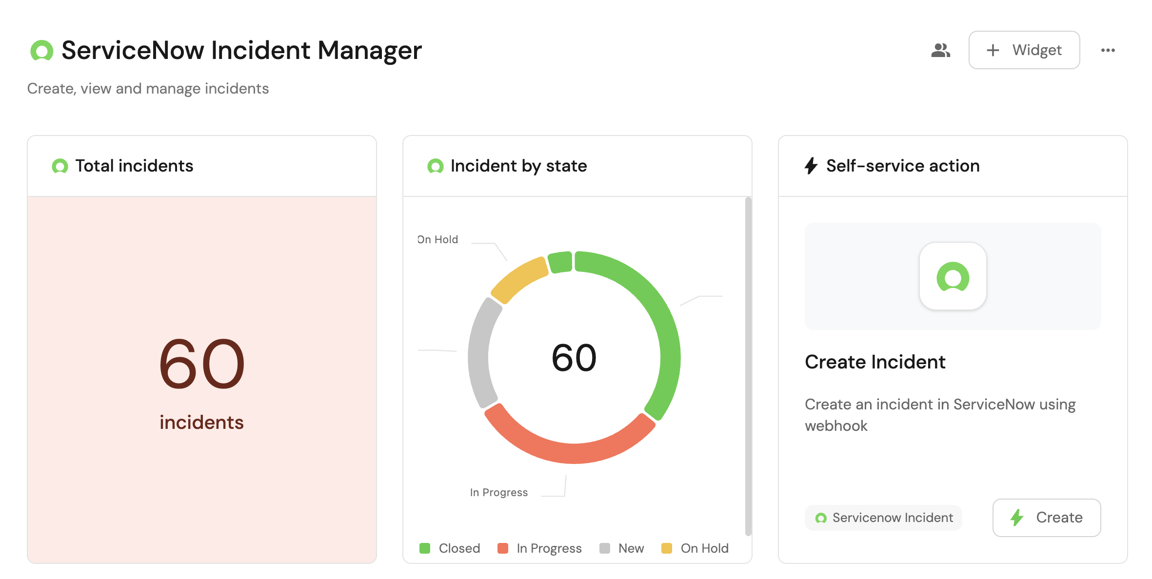 • Monitor the status and health of all ServiceNow incidents from a centralized dashboard.
