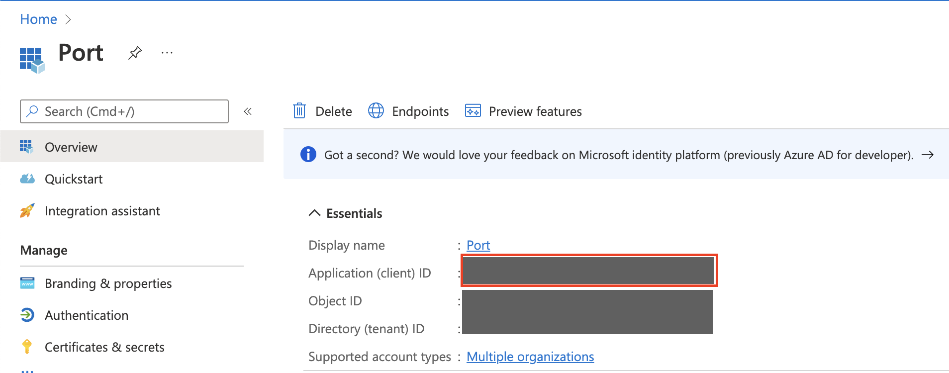 Application (Client) ID, which appears on the Port application overview page: